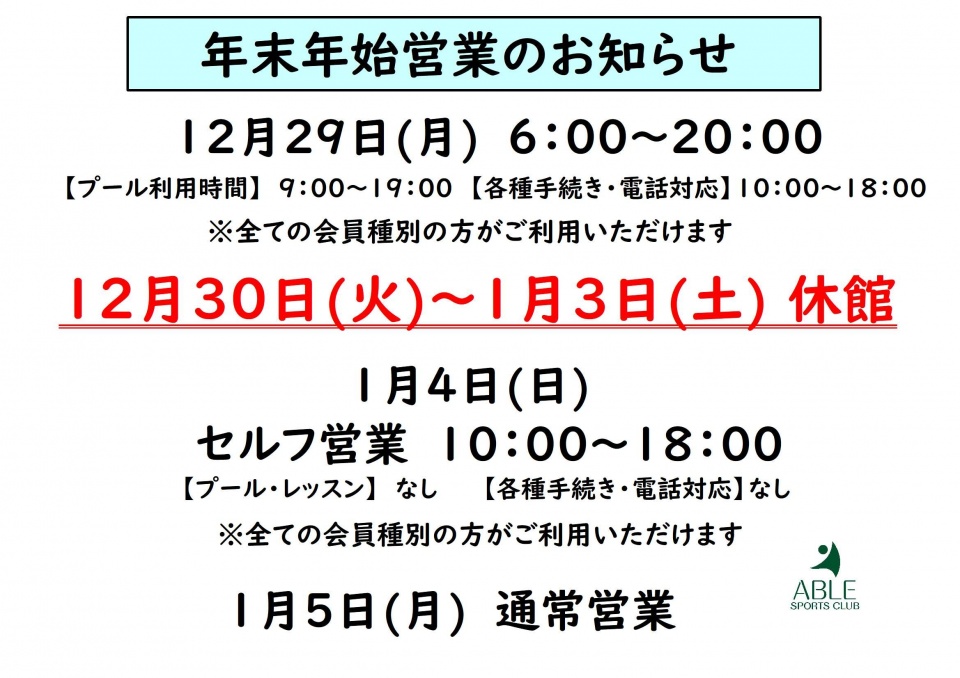 2025.11.26会員の方へ 年末年始のお知らせ いつもエイブルスポーツクラブ広島をご利用いただきありがとうございます! 年末年始の営業は以下の通りです。 お休み中はしっかりリフレッシュして、年明けから一緒に身体を動かしましょう!!