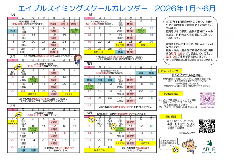 スイミングスクールエイブルカレンダー2025.7~12 2026.1~6