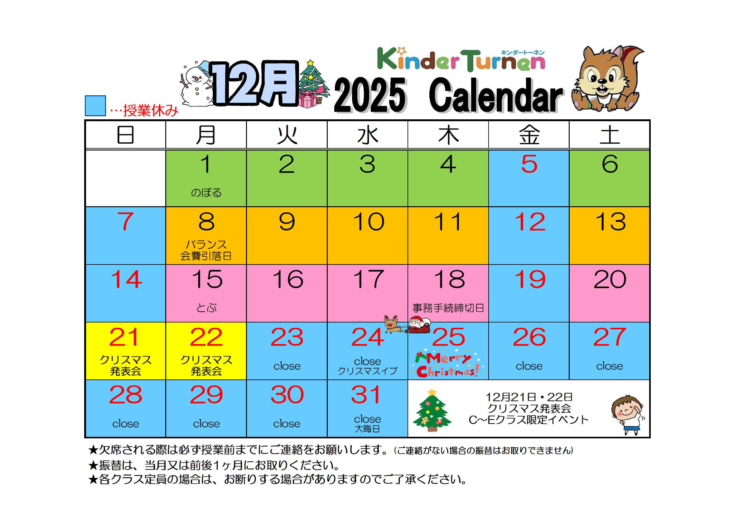 2025.11.28 【12月・1月の休館日のお知らせ】 【12月休館日】 上記水色の期間は休館日となります。 ※12月23日~31日は休館日となります。 【1月休館日】 上記水色の期間は休館日となります。 ※1月1日~3日、1月25日~31日は休館日となります。 お問い合わせは、、、 トップページ右上の『✉お問い合わせ』 広島校『✉メールフォーム』からご連絡ください。 またお急ぎの場合・会員様は、キンダートーネン広島のLINEよりご連絡ください。 ⇓QRコード、ID検索【kinder-hiroshima】