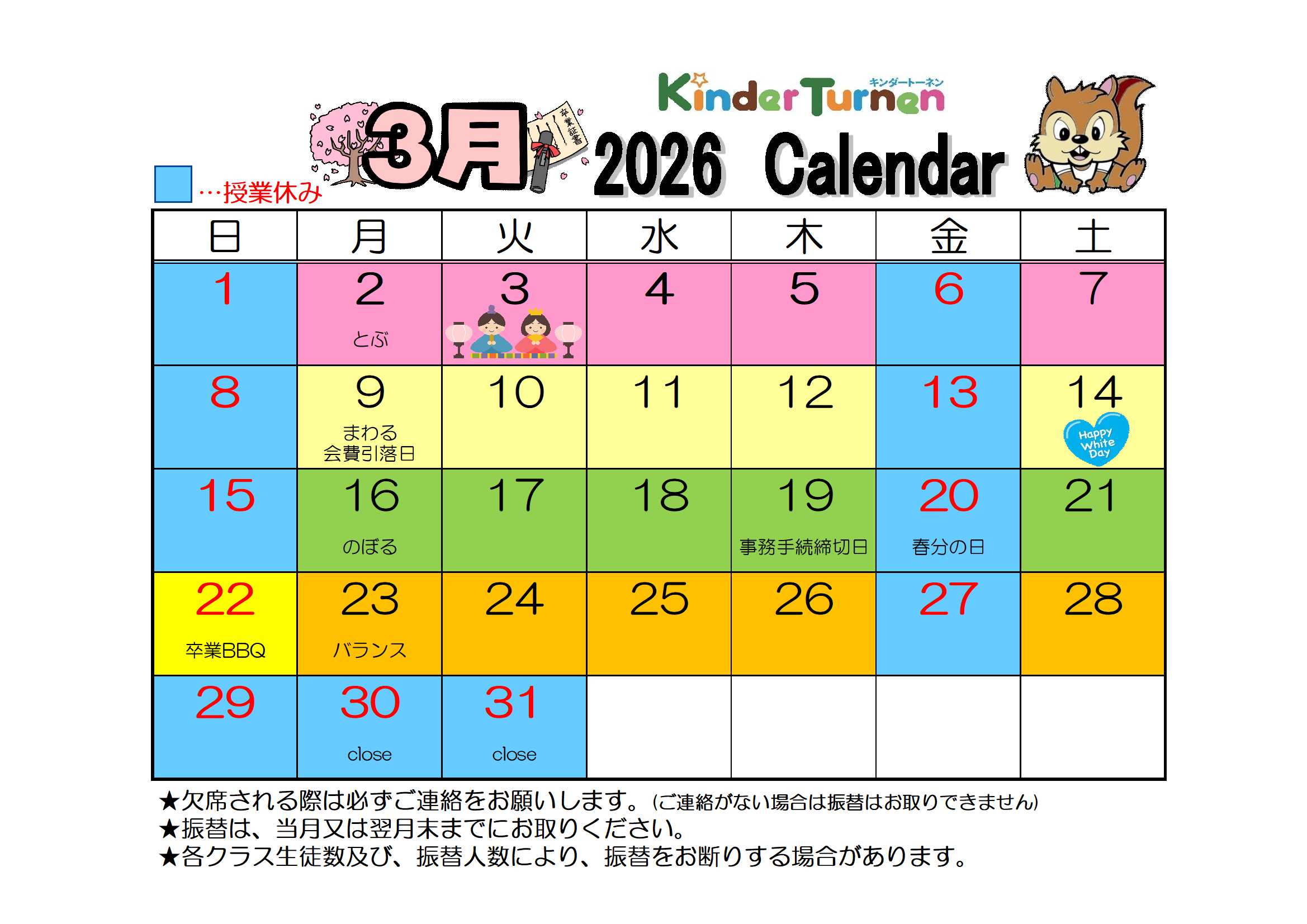 2026.03.02 【3月の休館日のお知らせ】 【休館日】 上記水色の期間は休館日となります。 お問い合わせは、、、 トップページ右上の『✉お問い合わせ』 広島校『✉メールフォーム』からご連絡ください。 またお急ぎの場合・会員様は、キンダートーネン広島のLINEよりご連絡ください。 ⇓QRコード、ID検索【kinder-hiroshima】